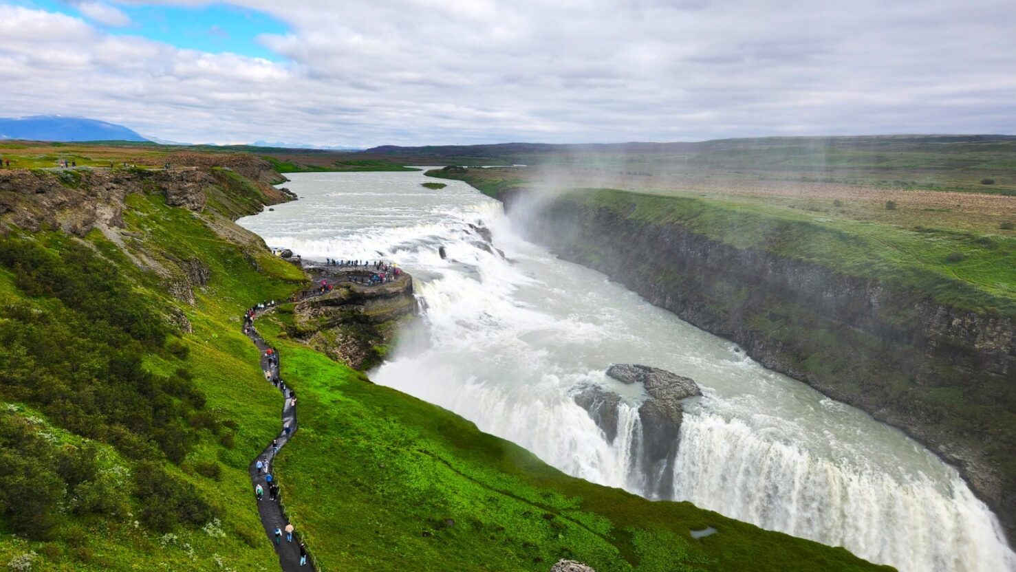 We departed Geysir Geothermal Area and arrived at Gullfoss Waterfalls about 10 minutes later. Gullfoss translates to “Golden Falls”. The distinctive two-tiered drop totaling about 105 feet makes Gullfoss dramatic and powerful as the waters of the Hvita River cascade into the deep canyon. The Hvita River originates from the Langjökull glacier, about 23 miles away, the 2nd largest glacier in Iceland. This incredible display of nature’s power is not to be missed.