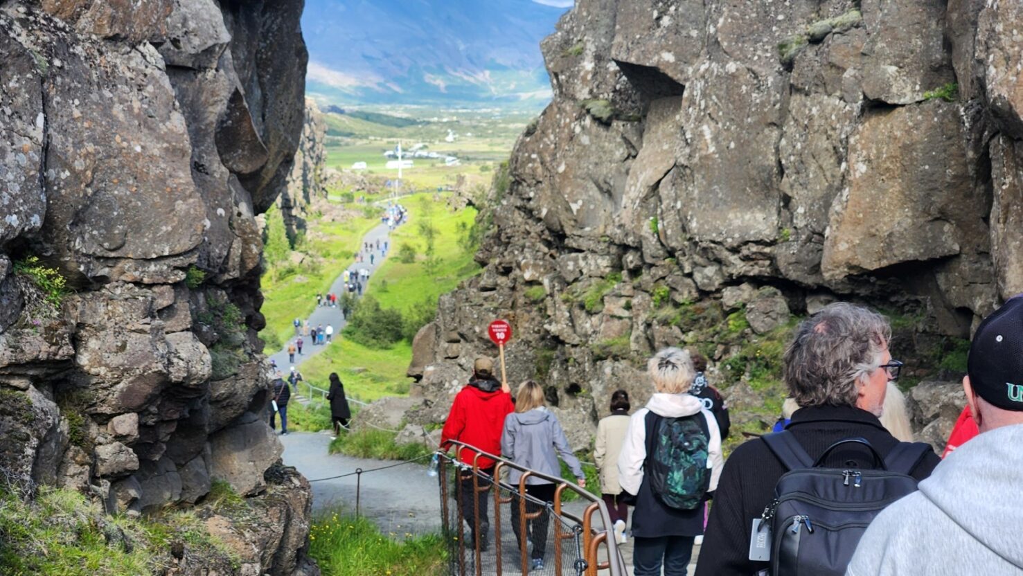 On our first full day on the Viking Venus, we departed on our first excursion, the famous Golden Circle tour. The Golden Circle is about 190 miles and 7.5 hours, including detours, that highlights Iceland’s natural and historic wonders. Starting and ending in Reykjavik, the tour includes Þingvellir National Park, the Geyser Geothermal Area, and Gullfoss Waterfalls (which gives its name to this tour).