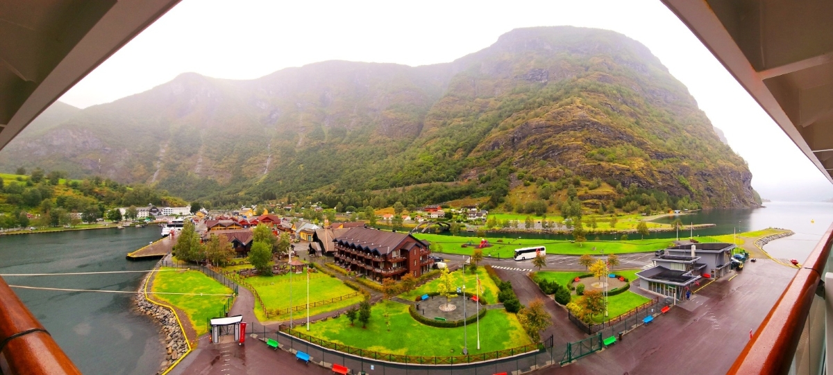 The little town of Flåm viewed from our terrace with a wide angle lens – so green. (L.Compisi)