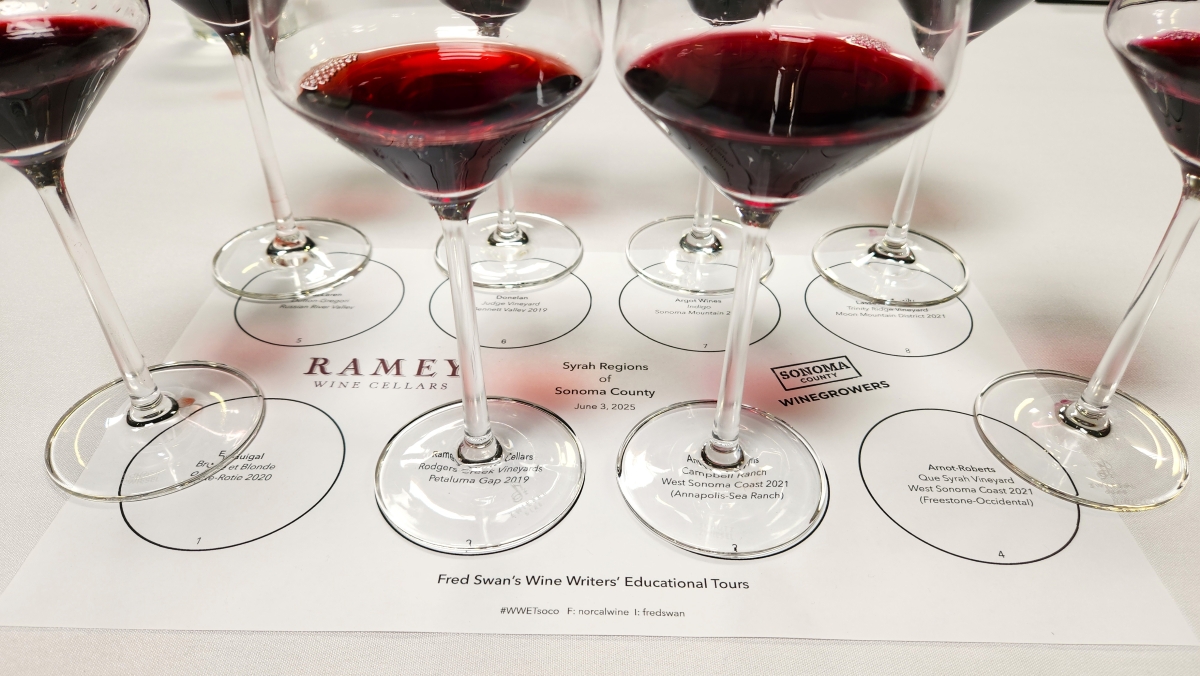 After lunch at Ramey Wine Cellars, we gathered for a special seminar devoted to the Syrah wines of Sonoma County. Seven different AVAs were represented, each glass offering a distinct voice in the chorus of Sonoma terroir: